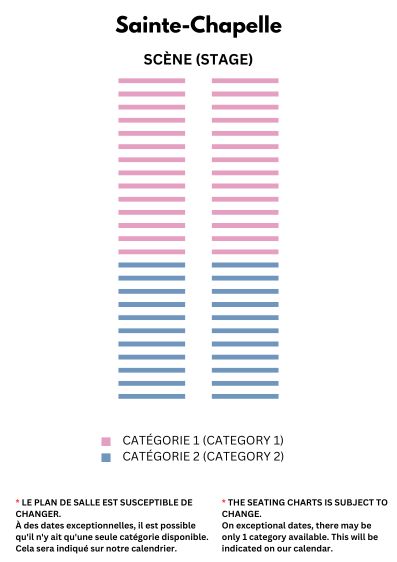 The concerts at the Sainte-Chapelle are on a free seating basis within the category selected at the time of check out. Therefore, you are able to choose your placement within your ticket category when you arrive at the Sainte-Chapelle. We recommend arriving as early as 40 minutes before the performance to obtain the best seats in your section!