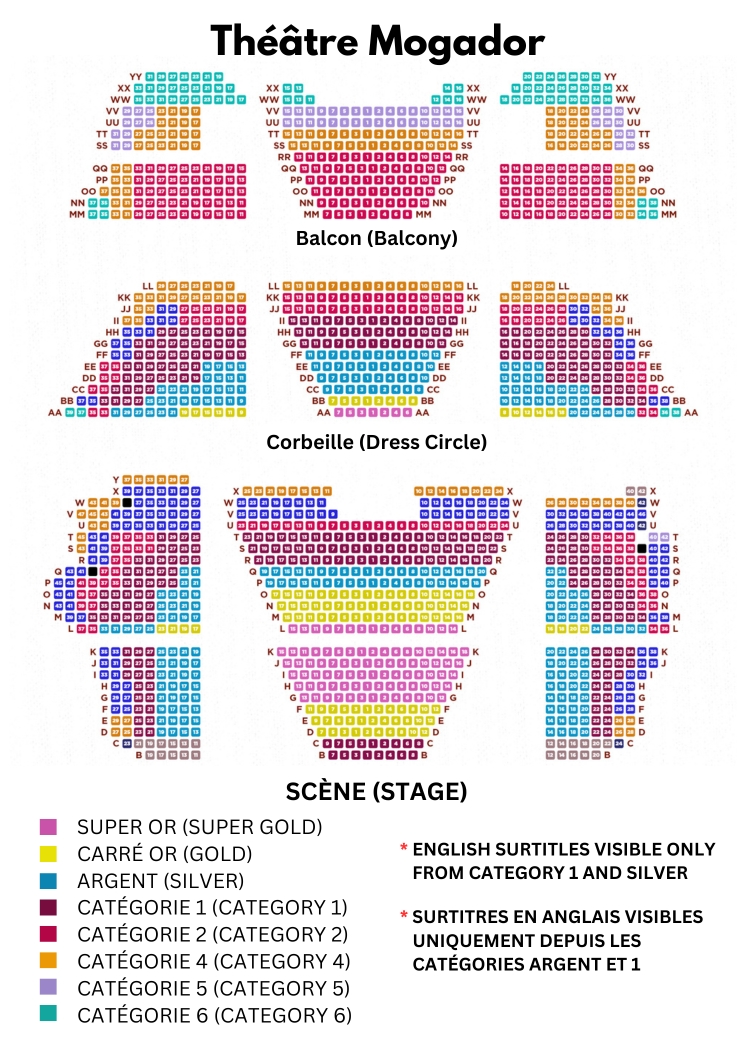 Surtitles (also called supertitles) are the equivalent theater of subtitles or as others may know it, captioned performances. That's because in French "on" means "above". At the Mogador Theater, the text is projected on the sides of the auditorium, above the stage. Read more about surtitles here.